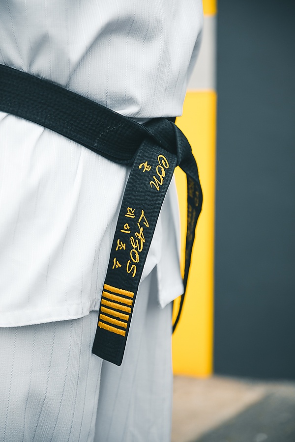 На чёрном поясе в тхэквондо и карате иногда имеется название боевого искусства, записанное на английском или оригинальном (корейском, японском) языке.