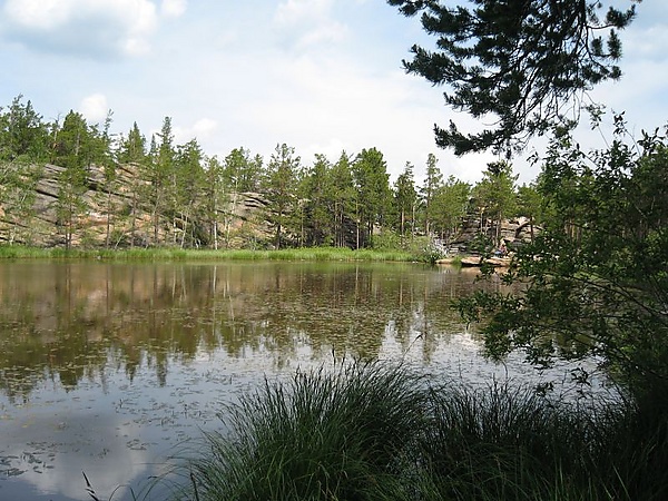 Озеро окружено полуразрушенными гранитными скалами типа «слоёный пирог», поросшими сосновым лесом.