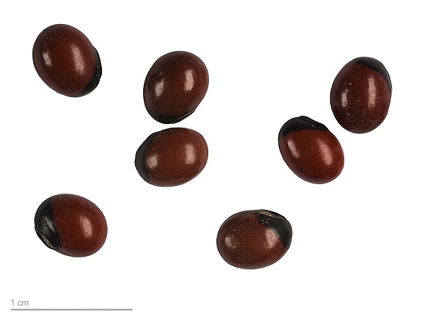 Плод — уплощённый боб. Внутри боба содержится четыре — шесть семян характерного киноварно-красного цвета с чёрным пятном на узком конце.