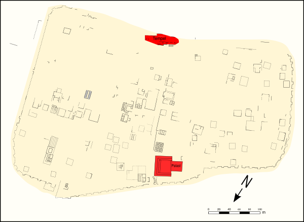Внутренний город пересекался в середине главной дорогой направленной с севера на юг, начинавшейся у северо-западных ворот, крупнейшие ворота города. При въезде в город, сразу за воротами справа, находился Королевский дворец площадью 1600 м². Восточный фасад дворца смотрел на главную дорогу. Главная дорога заканчивалась у расположенного на южной окраине значительного, но плохо сохранившегося храмового комплекса. Как остальная дорожная сеть была связана с главной дорогой, ещё точно не установлено. Очевидно, остальные дороги (улицы) располагались перпендикулярно или параллельно главной дороге, но пока лишь немногие перекрёстки раскопаны археологами. Поскольку все больше пространства в непосредственной близости к дорогам и в общественных местах и садов и небольших фермах сохраняются. Большинство зданий было простой прямоугольной формы и каждый этаж имел площадь по меньшей мере около 100 м². Некоторые здания выделяются своими размерами и сложной планировкой — вероятно они были предназначены для высшего класса.