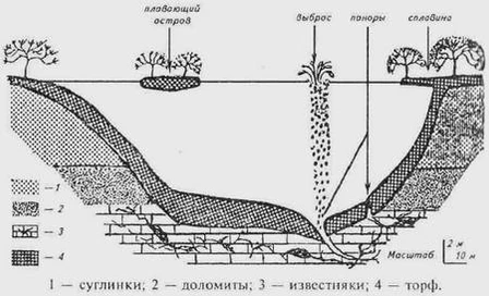 Ниже, под двухметровым водоупорным слоем, расположен второй водоносный горизонт, содержащий напорные артезианские воды. Между этими двумя горизонтами существует связь через вертикальные карстовые колодцы (поноры).