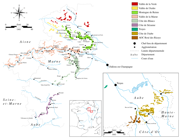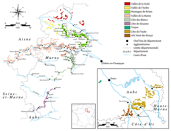 В 1927 году были законодательно закреплены границы участков возделывания винограда в Шампани в виде пяти винодельческих районов — Об (фр. Aube), Кот-де-Блан (фр. Côte des Blancs), Кот-де-Сезанн (фр. Côte de Sézanne), Монтань-де-Реймс (фр. Montagne de Reims) и Долина Марна (фр. Vallée de la Marne). Виноградники в регионе занимают площадь 33500 гектаров, окружая 319 коммун, где проживает 5000 виноградарей, производящих своё собственное вино, и 14000 фермеров, которые только продают виноград. Согласно ближайшим планам расширения в состав региона будет входить уже 359 коммун[3][16][17].