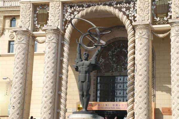 Выставочный центр был оформлен шанхайскими художниками. Здание украшено скульптурными барельефами. Перед главным входом изначально была установлена скульптура, изображающая советского и китайского рабочих с молотками в руках. После советско-китайского раскола скульптура была демонтирована и заменена на другую скульптуру рабочего.