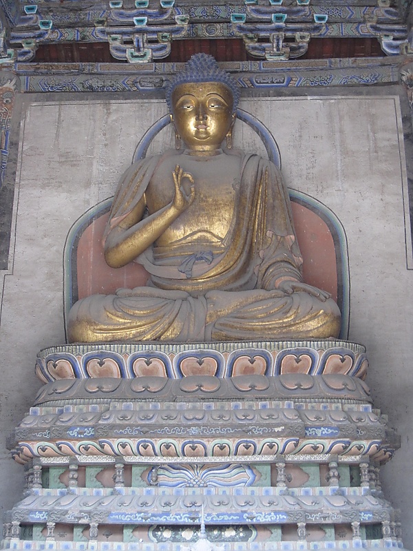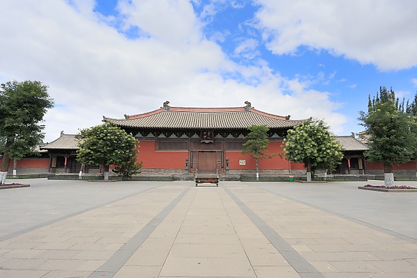 Главные ворота (кит. упр. 山门, пиньинь Shān Mén, палл. Шань Мэнь) это большой зал, построенный во времена империи Цзинь, в XII веке. Этот зал служит входом в храм[18]. В зале находятся статуи четырёх небесных царей, по два у каждой боковой стены[18]. В длину зал пять травей, две в ширину, общая площадь 278 м²[19]. Кронштейны, поддерживающие крышу позволяют присвоить зданию пятый уровень по Инцзао Фаши[20].
