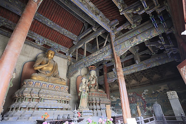 Зал Саньшэн (кит. упр. 三圣殿, пиньинь Sānshèng Diàn, палл. Саньшэн Дянь, буквально: «Зал трёх мудрецов»), это средний зал, построенный во времена империи Цзинь. В нем расположены статуи трёх мудрецов с Аватамсака-сутрами, в центре Вайрочана (уверсальний аспект Шакьямуни) и статуи Манджушри и Самантабхадры[13]. Крыша зала поддерживается очень малым количеством центральных колонн и имеет сложные стропила и кронштейны, что относит здание к шестому уровню, согласно Инцзао Фаши[14].