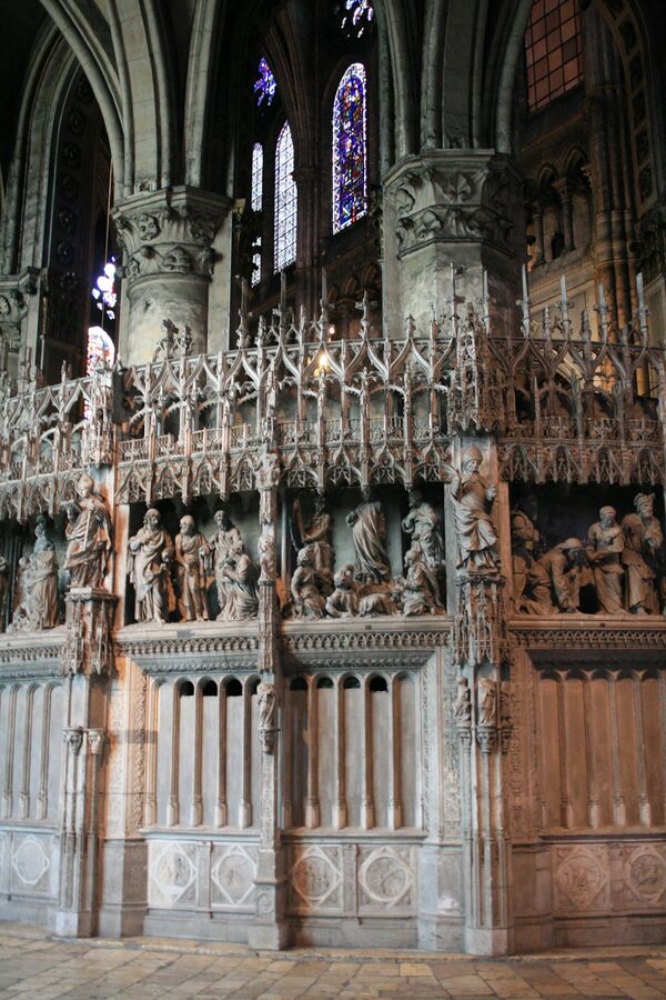 Не менее примечателен интерьер собора. Просторный неф, не имеющий себе равных во всей Франции, устремляется к великолепной апсиде, расположенной в восточной части собора. Между аркадами и верхними рядами окон центрального нефа располагается трифорий, массивные колонны собора окружены четырьмя мощными пилястрами. Сводчатая галерея деамбулатория огибает хор и алтарную часть, которые отделены от остального пространства резной стеной. Стена появилась в начале XVI века и два последующих столетия постепенно украшалась резными фигурами, изображающими сцены из жизни Христа и Богородицы.