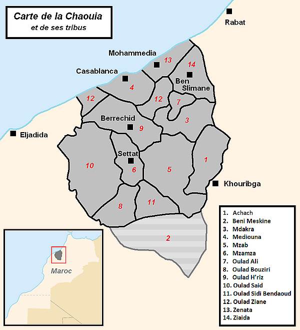 | Бени Мескин | Арабы | Ранее племя входило в регион Тадлы, однако в XIX веке присоединилось к Шауйе. |