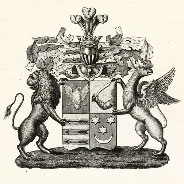 Щит увенчан дворянскими шлемом и короной. Нашлемник: три страусовых пера. Намёт на щите голубой и серебряный, подложенный золотом и красным. Щитодержатели: лев и гриф с обращёнными в сторону главами.