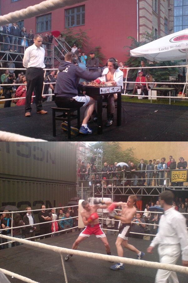 - В первом бое сошлись сильнейший спортсмен Берлинского клуба 25-летний Свен Рох (Sven Rooch, ) и испанский шахбоксер Джонатан Родригес Вега (Jonathan Rodriguez Vega). После двух напряженных боксерских раундов, побывав в нокдауне и заметно уступая в боксе своему испанскому противнику, немец Свен Рох одержал победу красивым матом в третьем шахматном раунде (пятом раунде всего поединка).