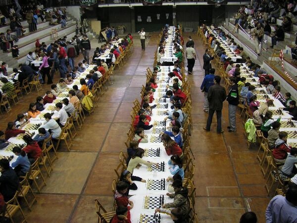 Турнир, в котором участвует слишком много спортсменов, чтобы провести круговой турнир, обычно проводится по швейцарской системе[24]. Игроки играют против оппонентов, имеющих такое же количество очков[25]. После первого тура игроки разбиваются на группы с одинаковым количеством очков, матчи проводятся между игроками из одной группы. Подбор соперников на таких турнирах имеет следующие трудности: