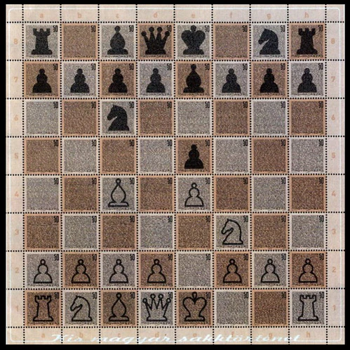В сентябре 2004 года почтовое ведомство Венгрии выпустила серию из 64 почтовых миниатюр (Mi #4885—4948), на которых микрошрифтом рассказано об истории шахмат в Венгрии. Каждая марка имеет номинал 50 форинтов, все они объединены в малый лист в виде шахматной доски, фигуры которой образуют начальную позицию венгерской партии. Впервые этот дебют встретился в матче по переписке Париж — Будапешт, который продолжался с 1842 по 1845 год.