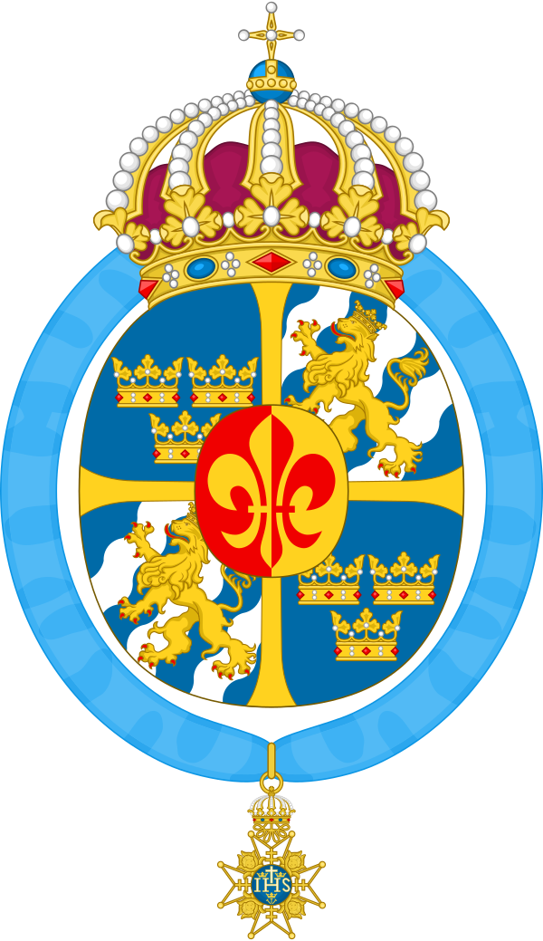 Появление большого государственного герба Швеции (швед. stora riksvapnet) датировано 1448 годом, а в 1943 году он принял современный облик. Первый законодательный акт, закрепивший юридический статус герба, был принят в 1908 году — до того изменения в государственный символ вносились королевскими указами[19]. Государственный герб служит и личным гербом шведского монарха. Как следствие, варианты герба могут служить персональными символами других членов королевской семьи. Изменения и дополнения, отличающие эти варианты от основного герба, утверждаются самим главой государства[20]. Начиная с правления Густава Васы, коронованного в 1523 году, традиционным стало помещение династического герба короля в центр герба государственного[21]. Герб королевы воспроизводит главный государственный символ за некоторыми исключениями: в нём отсутствует горностаевый намёт, а внутрь большого щита помещается её личный герб. Щит овевает лазоревая лента с Орденом Серафимов[22].
