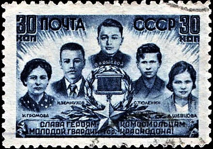 Слава «Молодой гвардии» Краснодона!: плакат / художник В. Корецкий; редактор П. Пискунов. — Ленинград: Искусство, 1943.