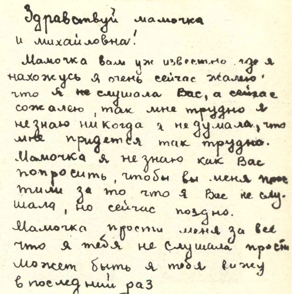 …Я была у вас, что, у вас плохое положение? Но все равно должно быть таким, как подлежит, целым и сохранным. Если будет плохо вам жить, то попробуйте пробраться ко мне, у нас значительно лучше, а без моего разрешения ничего не делайте. Я, возможно, отвезу или отнесу все понемножку свое приданное. Если приедете ко мне, то мой адрес. Гор. Краснодон, ул. Чкалова, N27.