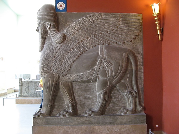 Изваяния грозных и высокомерных крылатых быков с надменными человеческими глазами, стоящих на страже у ворот гигантского дворца Саргона II в городе Дур-Шаррукине (ныне — Хорсабад в Ираке), имели магическую охранительную функцию. Пять ног крылатого чудовища создавали иллюзию движения, позволяя видеть его неподвижным анфас или идущим в профиль в зависимости от положения зрителя. До сих пор это существо поражает воображение остроумным композиционным решением. Каменные чудовища из дворца Саргона II (весом в 21 тонну каждое) хранятся сейчас в Париже, в Лувре.
