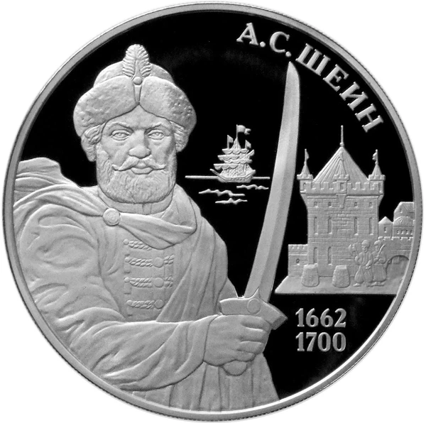 - На серебряной монете номиналом 25 рублей: на зеркальном поле диска справа — рельефный портрет А. С. Шеина в парадном старорусском платье с булавой в руке, слева от него — на фрагменте каменной стены — картуш с датами в две строки: «1662», и «1700», за стеной — обобщенные символы военных побед и реформ: солдат в европейском платье, мортира, копье с вымпелом — значком, бердыш и знамя второго Азовского похода, на дальнем плане крепостная башня, в центре — весельная шлюпка и парусник на морской глади, справа вдоль канта — надпись: «А. С. ШЕИН»[12].