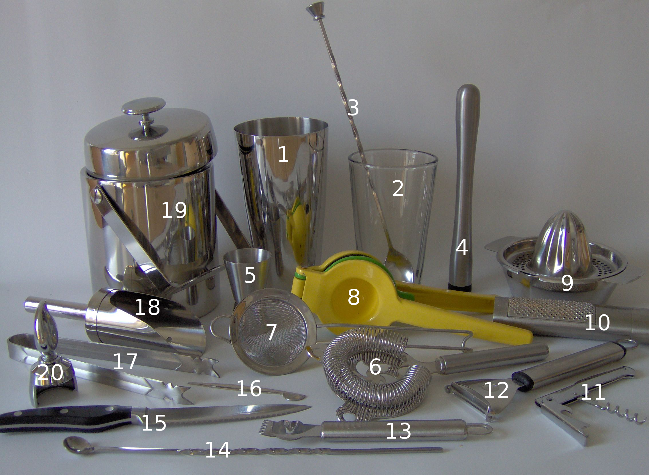 Барменский набор для приготовления коктейлей: (1, 2) бостонский шейкер, (6) стрейнер, (7) файн-стрейнер, ситечко, (5) джиггер, (4) мадлер, (8) ручной пресс-сквизер для цитрусовых, (3) барная ложка с кнопкой, (14) малая барная ложка и др. барный инвентарь