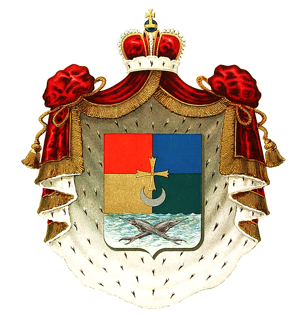 В щите, разделённом горизонтально на две неровные части, меньшая часть — нижняя и большая часть — верхняя, которая разделена на четыре поля: красное, голубое, золотое и зелёное, на пересечении квадратов изображён золотой крест, а под ним серебряная луна, рогам вверх обращённая. В нижней части щита две серебряные рыбы (осетровых пород), положенные крестообразно в реке (обозначает Белоозеро). Щит покрыт мантией и шапкой, принадлежащими княжескому достоинству[7][8]. Герб внесён в ОГДР (часть IV, стр. 2).