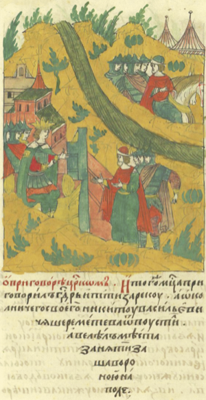| Лицевой летописный свод: «Об отпущении воевод на шведского короля. В том же году в месяце декабре отпустил царь и великий князь на Шведского короля Густава воевод своих за его неправду: в большом полку боярин и воевода князь Петр Михайлович Щенятев да боярин и воевода князь Дмитрий Федорович Палецкий. В передовом полку — воеводы Семен да Никита Васильевичи Шереметевы». | |