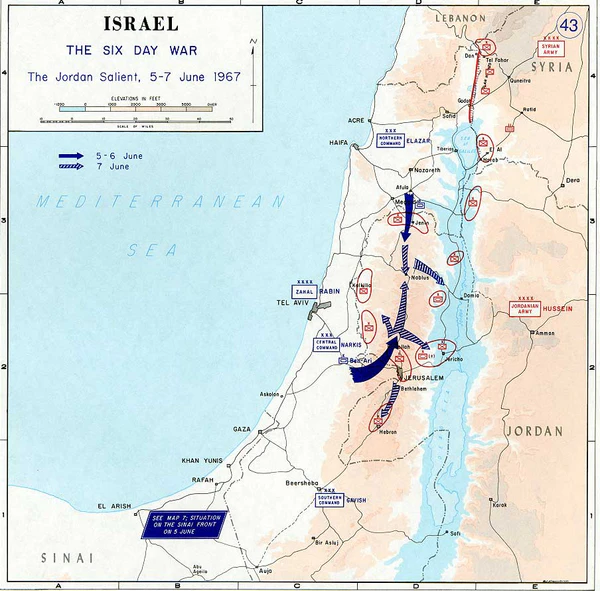 Израильская стратегия подразумевала избегать операций против Иордании и Сирии, пока не будет одержана победа на Синайском фронте. В то же время Израиль стремился установить контроль над Иерусалимом. Несмотря на то, что королю Хусейну было предложено сохранять нейтралитет в обмен на обещание о ненападении, арабское давление заставляло короля вступить в войну, а недавнее соглашение с Насером делало нейтралитет невозможным. Очевидно, он надеялся, что его дальнобойная артиллерия (155-мм «Long Tom»), направленная на Тель-Авив, удовлетворит союзников, не спровоцировав Израиль. Однако эти орудия представляли угрозу ВПП основной израильской северной авиабазы в Рамат-Давиде. Исходя из этого, после начала обстрела[35] Израилем было принято решение об операциях против Иордании.