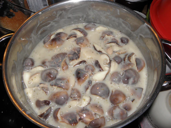 - Субстрат: Состоит из 80 % опилок и щепы лиственных пород (дуб, бук, берёза, осина, ива, тополь, клён, ольха, каштан) или измельчённой (1—2 см) соломы злаковых, и 20 % питательных добавок (отруби, мука бобовых, отходы пивного производства, мел, гипс). Оптимальный размер частиц опилок — 2—3 мм. Субстрат готовится по стерильной технологии с термической обработкой. Оптимальная влажность перед инокуляцией — 65 %[32].