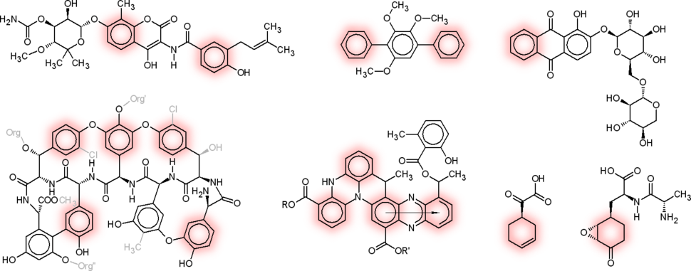Примеры природных соединений (вторичные метаболиты различных организмов), предшественники которых синтезируются шикиматным путём. Бензольные кольца и алициклические карбоциклы шикиматного происхождения оттенены цветом. Слева направо: верхний ряд — новобиоцин (Streptomyces niveus), грибной (Peniophora gigantea) терфенил, руберитриновая кислота (Rubia tinctorium); нижний ряд — структурная основа гликопептидных антибиотиков ристоцетинового (тейкопланинового) типа (Amycolatopsis lurida, Actinoplanes teichomyceticus), эсмеральдин B (Streptomyces antibioticus), кетомицин (Streptomyces antibioticus), бацилизин (Bacillus subtilis).