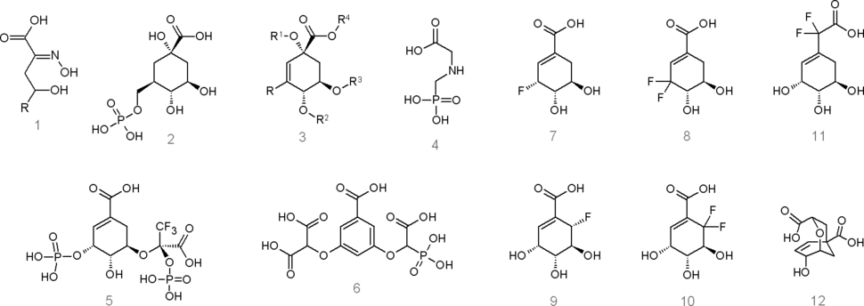 Некоторые соединения, блокирующие шикиматный путь или его ответвления в результате непосредственного или опосредованного конкурентного ингибирования определённых ферментов. Пометки: 1 — ингибитор ДАГФ-синтазы, 2 — ингибитор дегидрохиннат-синтазы (аналог полукетальной α-пиранозной формы ДАГФ), 3 — ингибитор дегидрохиннат-дегидратазы (аналоги одного из интермедиатов реакции), 4—6 — ингибиторы ЕПШФ-синтазы (4 — используемый в качестве гербицида глифосат, 5 — трифторметильный аналог переходного состояния, 6 — пример аналога, структура которого упрощена ахиральностью кольца в основе молекулы), 7—11 — фторшикиматные аналоги (9 — (6S)-6-фторшикимовая кислота — на два порядка более сильный антибактериальный агент, чем (6R)-6-фторшикимовая кислота (на рисунке не показана)[98]), 12 — эффективный ингибитор хоризматмутазы (аналог переходного состояния).