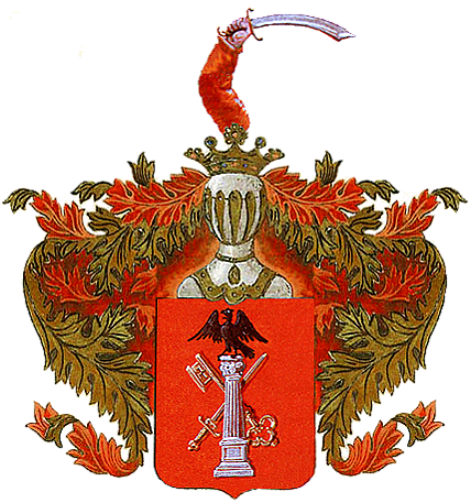 Описание герба: Выдержка из Общего гербовника На щите, имеющем красное поле, перпендикулярно поставлен серебреный столб, сквозь средину котораго крестообразно проходит шпага и ключ. Над сим столбом виден парящий черный орел. Щит увенчан обыкновенным дворянским шлемом с дворянскою на нем короною, на поверхности которой изображена выходящая рука с мечем. Намет на щите красный, подложенный золотом[1]. |
