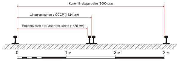 - Во время Великой Отечественной войны в гитлеровской Германии под кураторством Гитлера проектировалась сверхширококолейная железная дорога с шириной колеи 3 м. (три метра)[6]. Несколько линий такой железной дороги, сходящихся в Германии, планировалось проложить более-менее равномерно расходящимися до конечных городов на временно оккупированных вермахтом территориях Восточно-европейской равнины (СССР). «И всё это для того, чтоб возить в [Германию продукты земледелия и животноводства, производимые на захваченных территориях]» — цитата из книги (из эссе). Для такой ж. д. проектировались товарные вагоны грузоподъёмностью в девять раз больше обычных, двух-трёхэтажные пассажирские вагоны, в том числе элитные с роскошью, недоступной на обычной ж. д. (Гитлер по образованию был архитектором и прикладывал к этому свои художественные и архитектурные навыки). Предполагалось и, что по такой ж. д. можно будет перевозить довольно крупные речные и морские суда (значительно более крупные, чем удавалось по обычной ж. д.). Проектирование сверхширококолейной ж. д. продолжалось в Германии и в 1944 - 1945 годах, когда оно уже потеряло всякий практический смысл.