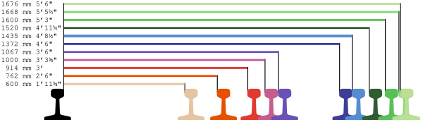 | 1676 | Индийская колея (5½ ft) | более 78 500 | Индия (Проект «Unigauge» — 42 000 км), Пакистан (7500 км), Шри-Ланка (1508 км), Аргентина (24 000 км), Чили, Бангладеш (950 км). (5-е место по распространённости в мире — 6 % общей длины всех железных дорог.) |