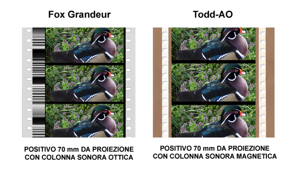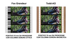 В 1928 году 70-мм широкий формат «Грандерфильм» (англ. Grandeur), разработанный компанией «XX век Фокс» (англ. 20th Century Fox), стал первым, имевшим коммерческое применение[16][17]. Технически он близок формату «Тодд-АО», разработанному в 1955 году, но использовал другую киноплёнку: на такой же шаг кадра у «Грандерфильм» приходится всего 4 увеличенных перфорации вместо 5 стандартных у современных форматов[12]. Между изображением и перфорацией располагалась одноканальная оптическая фонограмма переменной плотности «Western Electric» шириной 6,1 мм[18]. Компания «Парамаунт» (англ. Paramount) в 1929 году разработала киноплёнку «Магнафильм» (англ. Magnifilm) шириной 65-мм со стандартной перфорацией[12]. Проект стал международным, когда киносъёмочная и кинокопировальная аппаратура для этой киноплёнки были созданы французской компанией «Дебри», а кинопроекторы того же стандарта немецкой фирмой Zeiss Ikon[15].