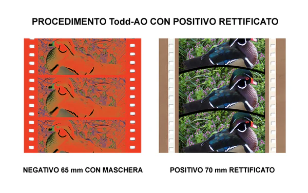Первой коммерчески успешной широкоформатной системой в 1955 году стала «Тодд-АО» (англ. Todd-AO), разработанная по инициативе одного из создателей «Синерамы» бродвейского бизнесмена и импресарио Майкла Тодда компанией «Америкен Оптикс» (англ. American Optics)[27][34]. Он сформулировал пожелание всех голливудских продюсеров в требовании, которое он поставил перед разработчиками: «„Синерама“ из одного проекционного окна»[35].