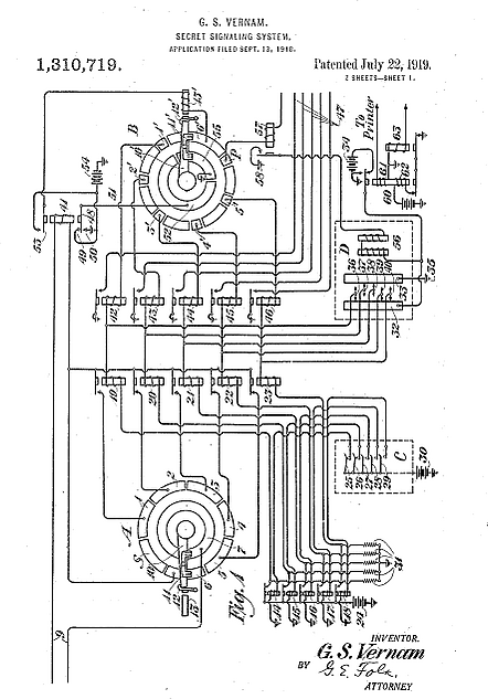 Вернам не использовал понятие «исключающее или» в патенте, но реализовал именно эту операцию в релейной логике. Каждый символ в сообщении преобразовывался побитовым XOR (исключающее или) с ключом бумажной ленты[7]. Джозеф Моборн (бывший тогда капитаном армии США, а впоследствии начальником корпуса связи) доработал эту систему так, чтобы последовательность символов на ключевой ленте была полностью случайной, поскольку в этом случае криптоанализ будет наиболее трудным.
