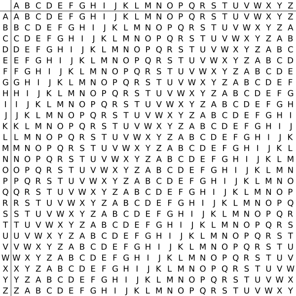 В компьютере такая операция соответствует сложению кодов ASCII символов сообщения и ключа по некоторому модулю. Кажется, что если таблица будет более сложной, чем циклическое смещение строк, то шифр станет надежнее. Это действительно так, если ее менять чаще, например, от слова к слову. Но составление таких таблиц, представляющих собой латинские квадраты, где любая буква встречается в строке или столбце один раз, трудоемко и его стоит делать лишь на ЭВМ. Для ручного же многоалфавитного шифра полагаются лишь на длину и сложность ключа, используя приведенную таблицу, которую можно не держать в тайне, а это упрощает шифрование и расшифровывание.[11]
