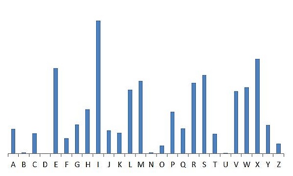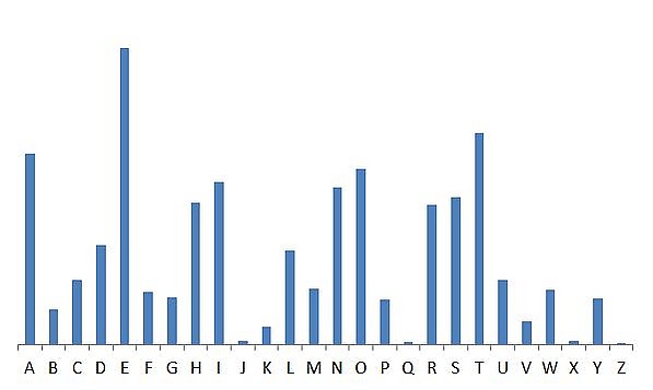 Гистограмма, построенная по стандартным частотностям букв в языке, имеет свои отличительные особенности. Они объясняются крайне неравномерным использованием букв в английском языке. Эта неравномерность как раз и позволяет эффективно применять частотный анализ.
