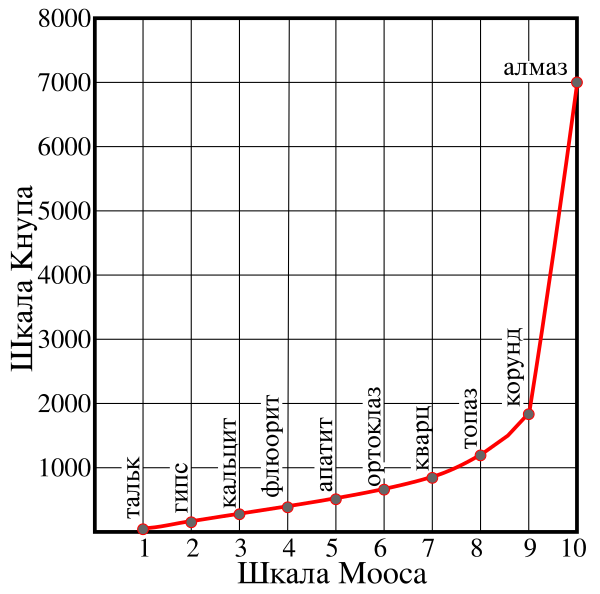 Значения шкалы от 1 до 10 соответствуют десяти достаточно распространённым минералам от талька до алмаза.