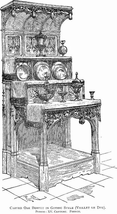 Из креденцы или параллельно с ней во Франции развился особый вид шкафа — дрессуар, на втором ярусе которого расположились открытые полки. На полках выставлялись напоказ ценные наборы столовой посуды и прочие предметы роскоши. Королю пришлось законодательно ограничить количество полок, разрешённое тому или иному лицу. Так, барону по статусу полагалось две, графу три, а герцогу четыре полки. Хорошо зная об этом указе французского короля, невесте английского короля Генриха VIII Анне Болейн к свадьбе подарили дрессуар, в котором было двенадцать полок[4]. Дрессуар, предназначенный для экспозиции наиболее ценной посуды в доме, соответственно украшался и был сам по себе весьма дорогим предметом мебели. С удешевлением производства стекла дрессуар превратился в современные горки, буфеты (серванты).