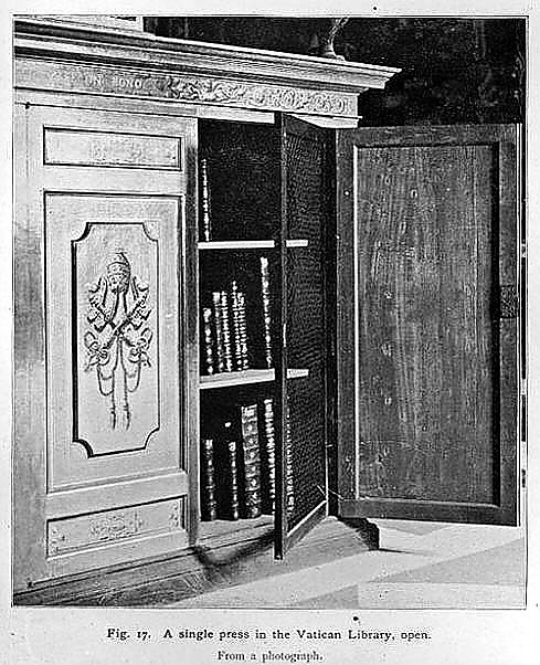 Постепенно и «armarium» развился в некое подобие шкафа в виде полок, располагавшихся обычно в нише, иногда с дверцами, для хранения домашнего скарба, ремесленных изделий, пергаментных и папирусных свитков и восковых табличек. От латинского «armarium» произошли современные итальянские, испанские и французские слова, обозначающие «шкаф» — armario, armadio и armoire соответственно, хотя долгое время так именовались преимущественно открытые шкафы для рукописных и позже печатных книг. От этого же слова происходит название специальной ниши или отдельного шкафчика в алтарной части католических храмов — «almery», где священники хранили предметы культа (чаши, судки, блюдца, подносы, священное масло и священнические облачения)[7][8].