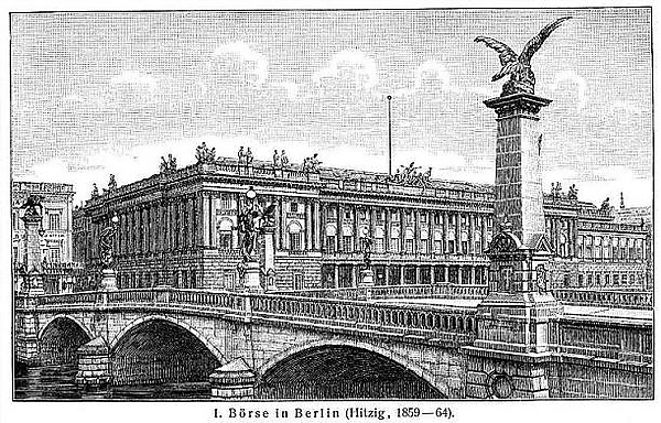 После неудачной революции 1848 года эмансипация прусской буржуазии приняла новое направление. Они вынуждены были оставить важнейшие политические позиции в государстве у дворянства, и вскоре значительно опередили их в процветающей экономике, что побудило создавать новую представительную архитектуру, отражающую их влиятельность. Образцом такой архитектуры стали здания эпохи Возрождения, поскольку Ренессанс с его интересом к естественным наукам, подъёмом торговли и искусства рассматривался как аналог событий XIX века. В качестве примера можно привести здание Берлинской фондовой биржи Фридриха Гитцига, которое было расположено в непосредственной близости от королевского дворца и стало продолжением сложившегося архитектурного ансамбля старой части города. После создания Германской империи (нем. Deutsche Reichsgründung) в 1871 году Берлин должен был стать её столицей. Правящие элиты поручили архитекторам создать новую архитектуру подчёркивающую величие нового государства. Основным вектором развития стал архитектуры стиль «Школы изящных искусств» (фр. École des Beaux Art) из побеждённой Франции. Строгой и сдержанной школе Шинкеля постоянно приходилось противостоять этим влияниям. В конце концов кризис был преодолён, архитекторы Мартин Гропиус и Хайно Шмиден, в особенности их проект Музея декоративного искусства (нем. Martin-Gropius-Bau), вывели школу Шинкеля из кризиса после 1866 года.