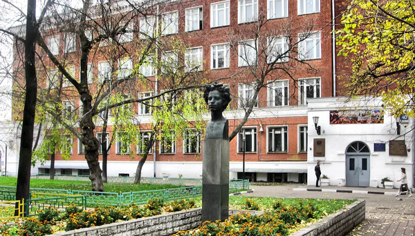 В 1967 году во дворе перед зданием школы был установлен памятник-бюст юного лицеиста Пушкина работы скульптора Екатерины Белашовой (архитектор Ю. О. Соколов)[9]. У входа в школу — мемориальная доска со словами «Здесь был дом, в котором 26 мая (6 июня) 1799 года родился А. С. Пушкин» (скульптор К. Г. Кошкин)[10].
