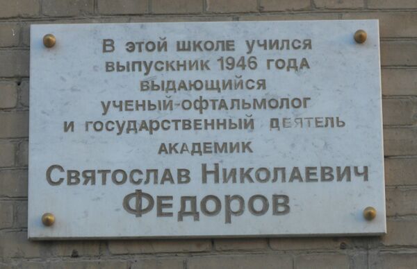 В 2002 фасаде здания была установлена мемориальная доска с текстом: «В этой школе учился выпускник 1946 года выдающийся ученый-офтальмолог и государственный деятель академик Святослав Николаевич Федоров». Мемориальная доска была установлена за счёт средств семьи Фёдорова[3].