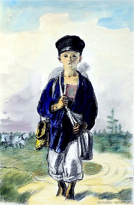 Поэт создал образ ребёнка из бедной крестьянской семьи, стремящегося к знаниям. Этот образ соответствует представлениям Н. А. Некрасова о будущих поколениях. Образ можно рассматривать как собирательный, у него нет конкретных черт. Описывая оборванный вид крестьянского паренька («Ноги босы, грязно тело, и едва прикрыта грудь…»), поэт подчёркивает его дальний одинокий путь и преодоление больших трудностей. Это указывает на его энтузиазм и высокие устремления[2].