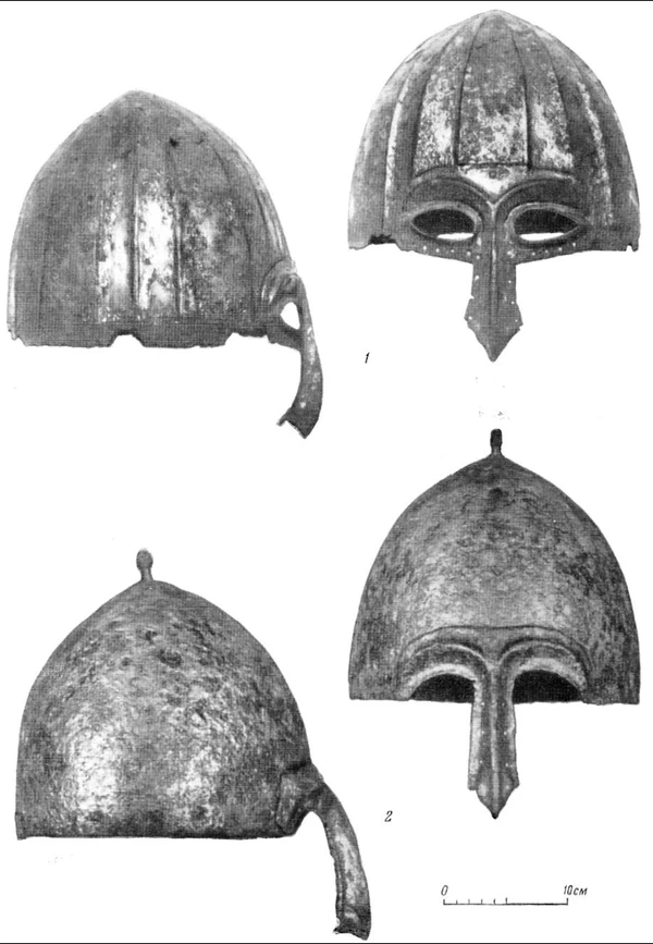 По мнению Ю. Ю. Петрова, эти шлемы происходят от вендельских шлемов, также нередко имевших полумаски[5].