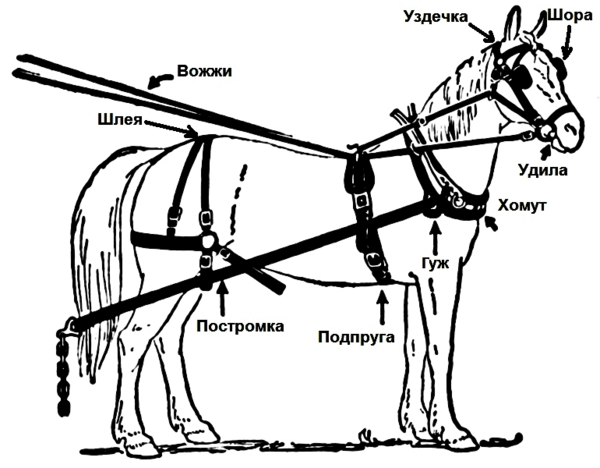 - широкий ободовый ремень — обхватывающего лошадь с боков и вокруг бёдер, концами пристегивается к гортам хомута;