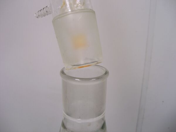 - Недостаток смазки в шлифовом соединении или неподходящая смазка. Некоторые соединения могут растворять смазку, что приводит к контакту между двумя оголёнными частями шлифа. При нагревании смазка может чрезмерно разжижаться и вытечь из шлифа, что особенно легко происходит при работе при нагревании под вакуумом, когда атмосферное давление вжимает керн в муфту[8].