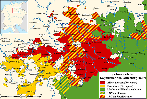 Вскоре сдался и Виттенберг. Карл потребовал от пленённого Иоганна Фридриха отречения от курфюршеского достоинства и от земель, значительная часть которых должна была перейти к Морицу, другая часть — к Фердинанду. Часть земель была оставлена для детей и брата Иоганна-Фридриха. Иоганн Фридрих 19 мая 1547 года согласился на эти условия, подписав Виттенбергскую капитуляцию.