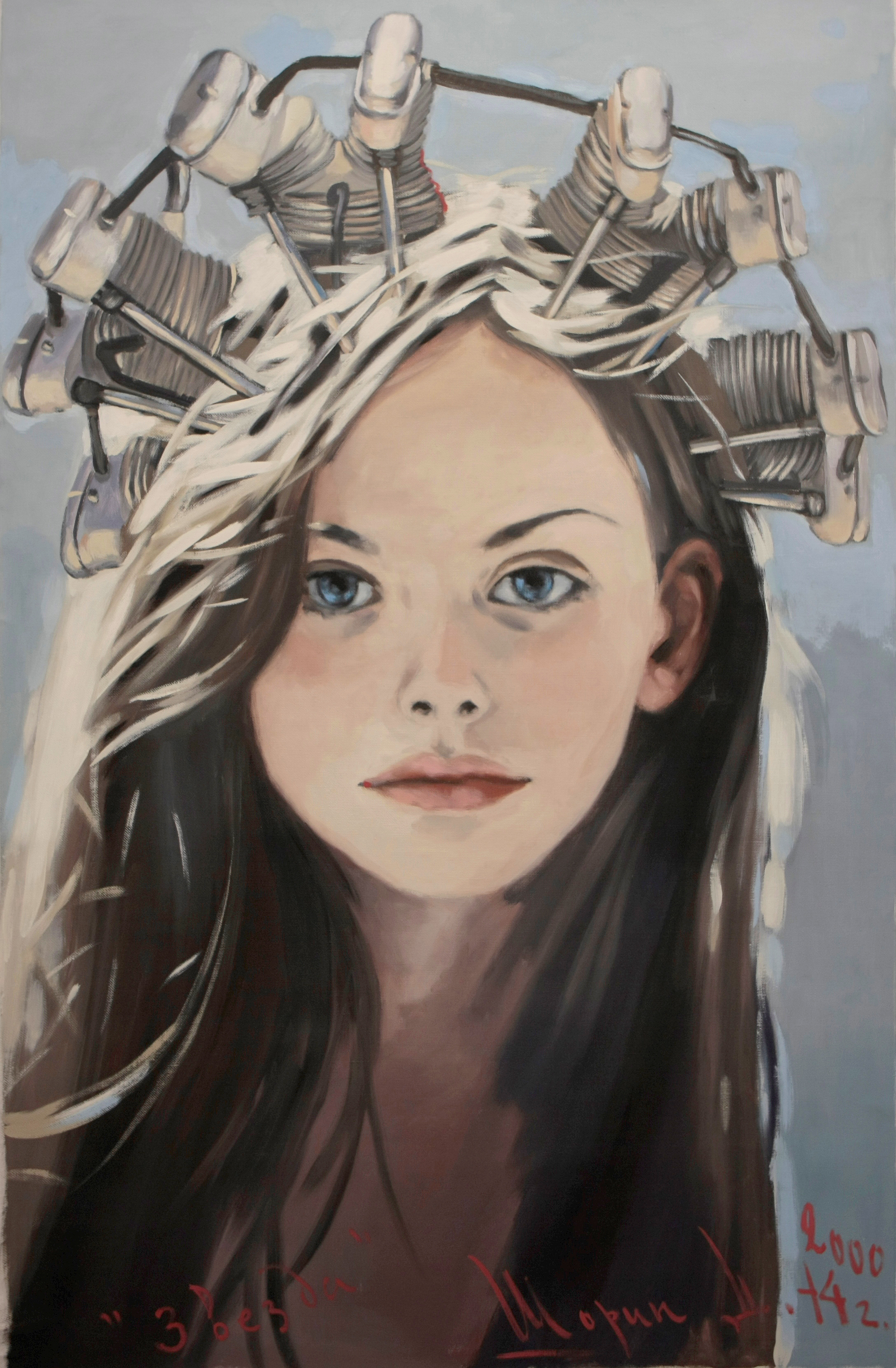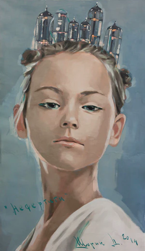 Проект с предметами на голове включает в себя картины «Ильюшин», «Звезда», «On/Off», «7 часов», «Нефертити» 2014 и «Нефертити» 2021 года, а также скульптуры «Юна» и «Тима». Серия с детскими головами и технологическими конструкциями — аллегория про аналоговое мышление. Про то, как дети стали заново проникать в физику вещей и суть вещей в их аналоговой структуре. На голове у них цилиндры звездообразного авиационного двигателя, а ум направлен вглубь явлений, несмотря на глобальную компьютеризацию. На данный момент скульптуры «Юна» и «Тима» находятся в Рижском аэропорту.