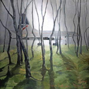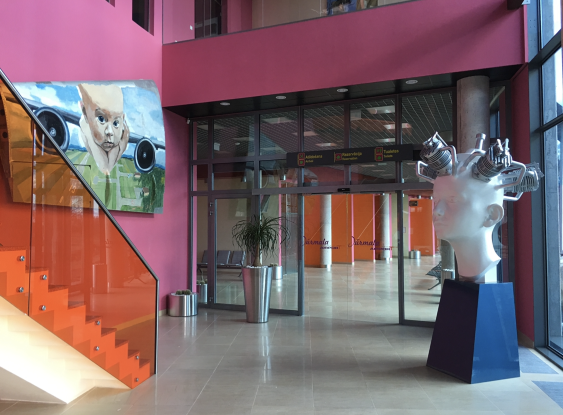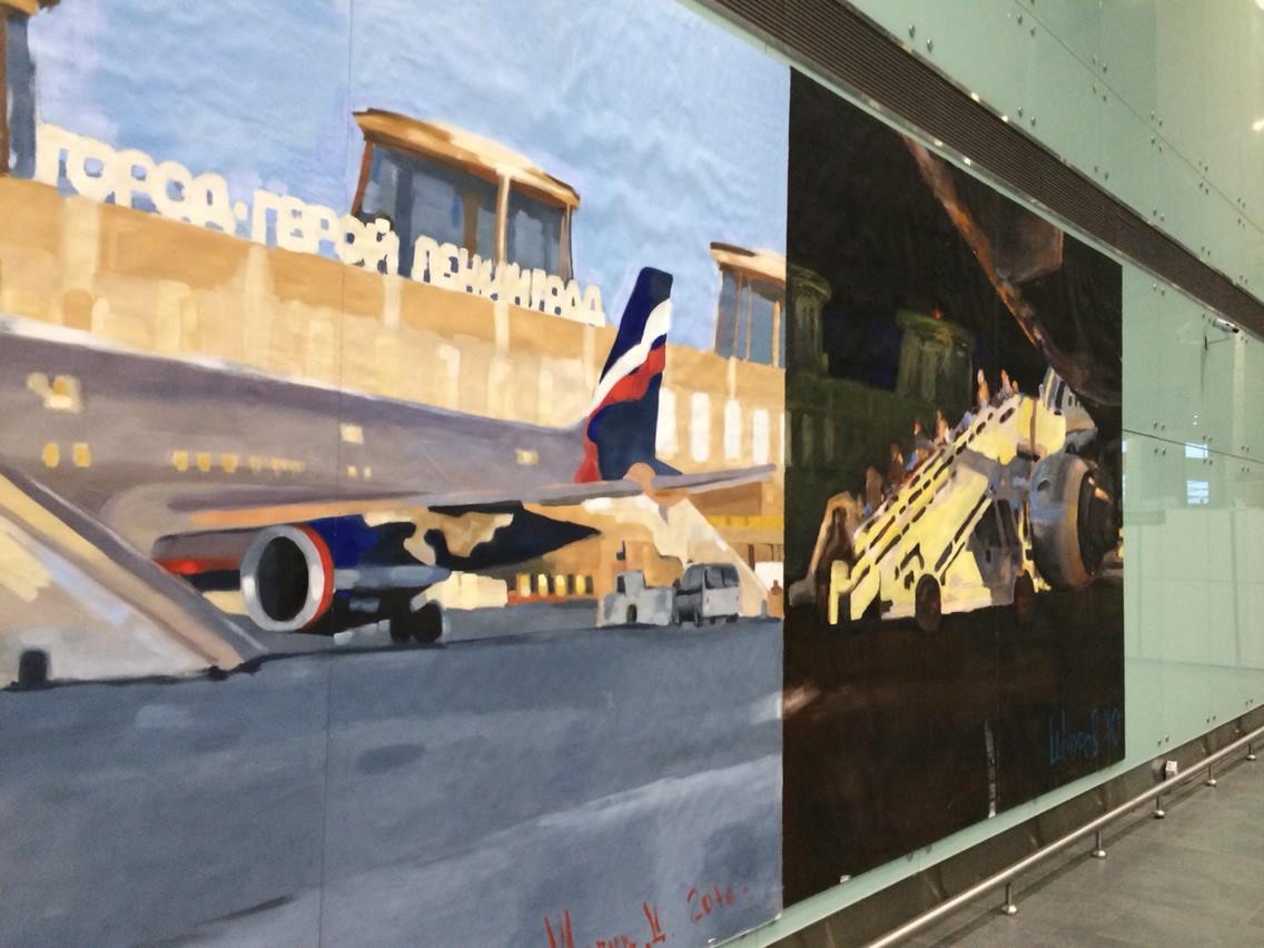 «В галерее мы имитируем взлётно-посадочную полосу с разметкой. На картине „Лётное поле“ здание аэропорта Пулково, два лайнера, по трапам сходят люди. Мы хотим показать настоящие ворота современного мегаполиса» — Дмитрий Шорин.