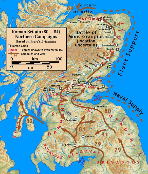 Сочинение зятя Агриколы Тацита упоминает победу римлян у «Граупийских гор» (лат. Mons Graupius), ставших тёзками гор Грампианских, хотя современные историки оспаривают подобную трактовку. В это время римляне, похоже, повторили совершённое столетием ранее плавание Пифея вокруг острова и получили данные от местного населения, установив границу-лимес сначала у хребта Гаск, которую потом сдвинули к югу у Солуэй-Ферта. Этот рубеж впоследствии стал известен как Адрианов вал. Несколько римских командиров пытались полностью покорить земли к северу от этой границы, одна из таких попыток окончилась возведением Антонинова вала. Несмотря на громкие утверждения в подделанной рукописи XVIII века, в настоящее время принято считать, что Рим не мог контролировать даже половину нынешней Шотландии и влияние империи на эту территорию прекратилось после 211 года.