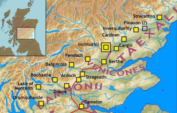 Летом 78 г. Гней Юлий Агрикола прибыл в Британию с целью приступить к обязанностям её наместника. Через два года римские легионеры возвели важный форт в Тримонтиум около современного Мелроза. Проведённые в XX веке раскопки обнаружили остатки нескольких строений, римские монеты и глиняную посуду. Также были найдены инвентарь римских солдат вроде коллекции доспехов и конской фурнитуры. Агрикола к устью «реки Таус» (обычно считается, что речь шла о реке Тей), где основал форты, включая легендарное укрепление в Инчтутиле.[27]